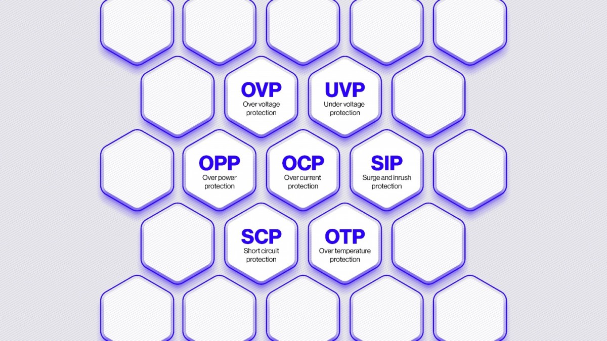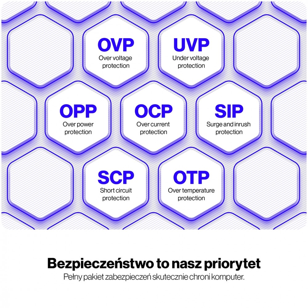 | Zabezpieczenia / filtry | Przeciwprzepięciowe (OVP), Termiczne (OTP), Przeciwprzeciążeniowe (OPP), Przed przepięciami i udarami (SIP), Przeciwzwarciowe (SCP), Przed zbyt wysokim prądem (OCP), Przed zbyt niskim napięciem (UVP) |