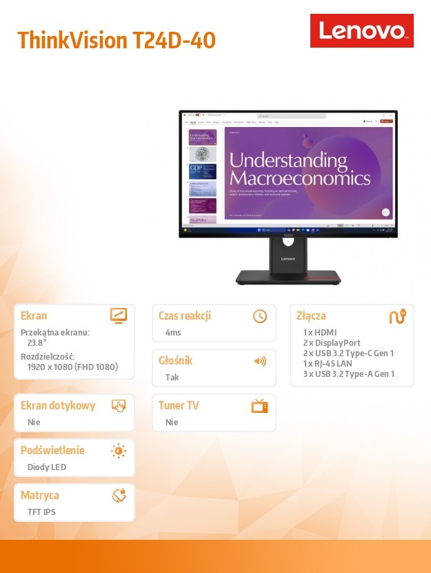 Lenovo Monitor ThinkVision T24D-40 23.8 cala 64B9GAT1EU