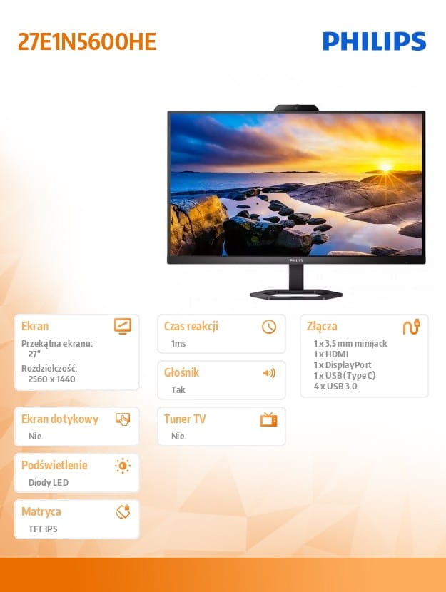 Philips Monitor 27 cali 27E1N5600HE IPS HDMI DP USB-C Pivot Kamera Głośniki